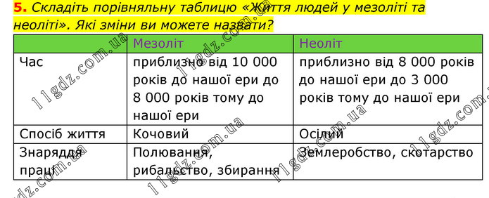 Складіть порівняльну таблицю «Життя людей у мезоліті та неоліті». Які зміни ви можете назвати? Мезоліт Неоліт Час приблизно від 10 000 років до нашої ери до 8 000 років тому до нашої ери приблизно від 8 000 років до нашої ери до 3 000 років тому до нашої ери Спосіб життя Кочовий Осілий Знаряддя праці Полювання, рибальство, збирання Землеробство, скотарство