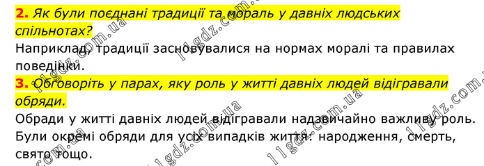 2. Як були поєднані традиції та мораль у давніх людських спільнотах? Наприклад, традиції засновувалися на нормах моралі та правилах поведінки. 3. Обговоріть у парах, яку роль у житті давніх людей відігравали обряди. Обради у житті давніх людей відігравали надзвичайно важливу роль. Були окремі обряди для усіх випадків життя: народження, смерть, свято тощо.