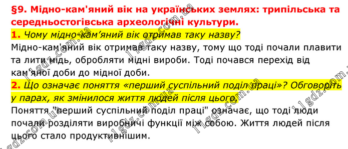 §9. Мідно-кам'яний вік на українських землях: трипільська та середньостогівська археологічні культури. 1. Чому мідно-кам’яний вік отримав таку назву? Мідно-кам'яний вік отримав таку назву, тому що тоді почали плавити та лити мідь, обробляти мідні вироби. Тоді почався перехід від кам'яної доби до мідної доби. 2. Що означає поняття «перший суспільний поділ праці»? Обговоріть у парах, як змінилося життя людей після цього. Поняття "перший суспільний поділ праці" означає, що тоді люди почали розділяти виробничі функції між собою. Життя людей після цього стало продуктивнішим.