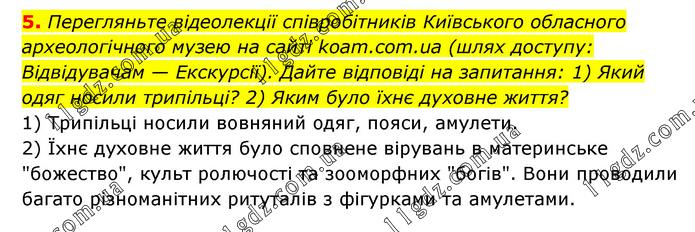 Перегляньте відеолекції співробітників Київського обласного археологічного музею на сайті koam.com.ua (шлях доступу: Відвідувачам — Екскурсії). Дайте відповіді на запитання: 1) Який одяг носили трипільці? 2) Яким було їхнє духовне життя? 1) Трипільці носили вовняний одяг, пояси, амулети. 2) Їхнє духовне життя було сповнене вірувань в материнське "божество", культ ролючості та зооморфних "богів". Вони проводили багато різноманітних ритуталів з фігурками та амулетами.