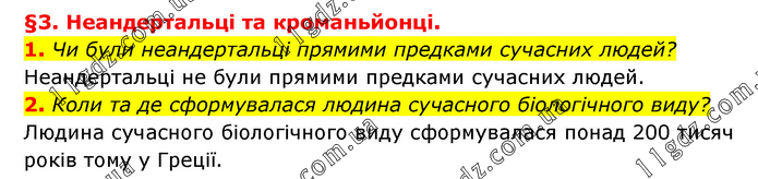 §3. Неандертальці та кроманьйонці. 1. Чи були неандертальці прямими предками сучасних людей? Неандертальці не були прямими предками сучасних людей. 2. Коли та де сформувалася людина сучасного біологічного виду? Людина сучасного біологічного виду сформувалася понад 200 тисяч років тому у Греції.