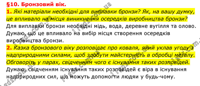 §10. Бронзовий вік. 1. Які матеріали необхідні для виплавки бронзи? Як, на вашу думку, це впливало на місця виникнення осередків виробництва бронзи? Для виплавки бронзи необхідні мідь, вода, деревне вугілля та олово. Думаю, що це впливало на вибір місця створення осередків виробництва бронзи. 2. Казка бронзового віку розповідає про коваля, який уклав угоду з надприродними силами, щоб здобути майстерність в обробці металу. Обговоріть у парах, свідченням чого є існування таких розповідей. Думаю, свідченням існування таких розповідей є віра в існування надприродних сил, що можуть допомогти людям у будь-чому.