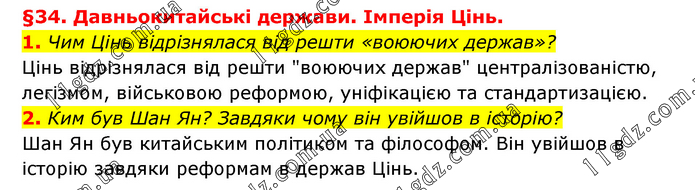 §34. Давньокитайські держави. Імперія Цінь. 1. Чим Цінь відрізнялася від решти «воюючих держав»? Цінь відрізнялася від решти "воюючих держав" централізованістю, легізмом, військовою реформою, уніфікацією та стандартизацією. 2. Ким був Шан Ян? Завдяки чому він увійшов в історію? Шан Ян був китайським політиком та філософом. Він увійшов в історію завдяки реформам в держав Цінь.