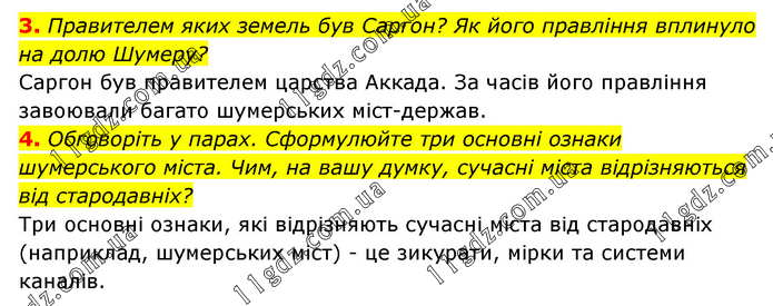 3. Правителем яких земель був Саргон? Як його правління вплинуло на долю Шумеру? Саргон був правителем царства Аккада. За часів його правління завоювали багато шумерських міст-держав. 4. Обговоріть у парах. Сформулюйте три основні ознаки шумерського міста. Чим, на вашу думку, сучасні міста відрізняються від стародавніх? Три основні ознаки, які відрізняють сучасні міста від стародавніх (наприклад, шумерських міст) - це зикурати, мірки та системи каналів.