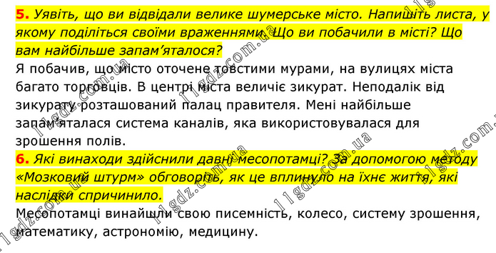 5. Уявіть, що ви відвідали велике шумерське місто. Напишіть листа, у якому поділіться своїми враженнями. Що ви побачили в місті? Що вам найбільше запам’яталося? Я побачив, що місто оточене товстими мурами, на вулицях міста багато торговців. В центрі міста величіє зикурат. Неподалік від зикурату розташований палац правителя. Мені найбільше запам’яталася система каналів, яка використовувалася для зрошення полів. 6. Які винаходи здійснили давні месопотамці? За допомогою методу «Мозковий штурм» обговоріть, як це вплинуло на їхнє життя, які наслідки спричинило. Месопотамці винайшли свою писемність, колесо, систему зрошення, математику, астрономію, медицину.