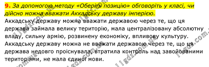 За допомогою методу «Оберіть позицію» обговоріть у класі, чи дійсно можна вважати Аккадську державу імперією. Аккадську державу можна вважати державою через те, що ця держава займала велику територію, мала централізовану абсолютну владу, сильну армію, розвинену економіку, впливову культуру. Аккадську державу можна не вважати державою через те, що ця держава недовго проіснувала, втратила контроль над завойованими територіями, не мала єдиної мови.