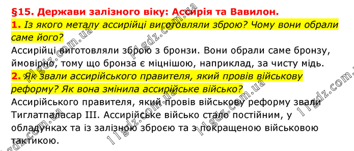 §15. Держави залізного віку: Ассирія та Вавилон. 1. Із якого металу ассирійці виготовляли зброю? Чому вони обрали саме його? Ассирійці виготовляли зброю з бронзи. Вони обрали саме бронзу, ймовірно, тому що бронза є міцнішою, наприклад, за чисту мідь. 2. Як звали ассирійського правителя, який провів військову реформу? Як вона змінила ассирійське військо? Ассирійського правителя, який провів військову реформу звали Тиглатпаласар III. Ассирійське військо стало постійним, у обладунках та із залізною зброєю та з покращеною військовою тактикою.