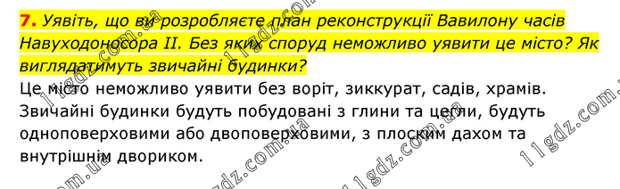 Уявіть, що ви розробляєте план реконструкції Вавилону часів Навуходоносора ІІ. Без яких споруд неможливо уявити це місто? Як виглядатимуть звичайні будинки? Це місто неможливо уявити без воріт, зиккурат, садів, храмів. Звичайні будинки будуть побудовані з глини та цегли, будуть одноповерховими або двоповерховими, з плоским дахом та внутрішнім двориком.
