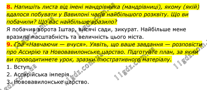 8. Напишіть листа від імені мандрівника (мандрівниці), якому (якій) вдалося побувати у Вавилоні часів найбільшого розквіту. Що ви побачили? Що вас найбільше вразило? Я побачив ворота Іштар, висячі сади, зикурат. Найбільше мене вразила масштабність та величність цього міста. 9. Гра «Навчаючи — вчуся». Уявіть, що ваше завдання — розповісти про Ассирію та Нововавилонське царство. Підготуйте план, за яким ви проводитимете урок, зразки ілюстративного матеріалу. 1. Вступ. 2. Ассирійська імперія. 3. Нововавилонське царство.