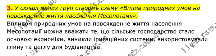 У складі малих груп створіть схему «Вплив природних умов на повсякденне життя населення Месопотамії». Впливом природних умов на повсякденне життя населення Месопотамії можна вважати те, що сільське господарство стало основою економіки, виникли іригаційних системи, використовували глину та цеглу для будівництва.
