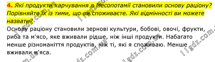 Які продукти харчування в Месопотамії становили основу раціону? Порівняйте їх із тими, що ви споживаєте. Які відмінності ви можете назвати? Основу раціону становили зернові культури, бобові, овочі, фрукти, риба та м'ясо, яке вживали рідше, ніж інші продукти. Набагато менше різноманіття продуктів, ніж ті, які я споживаю. Менше вживали м'яса.