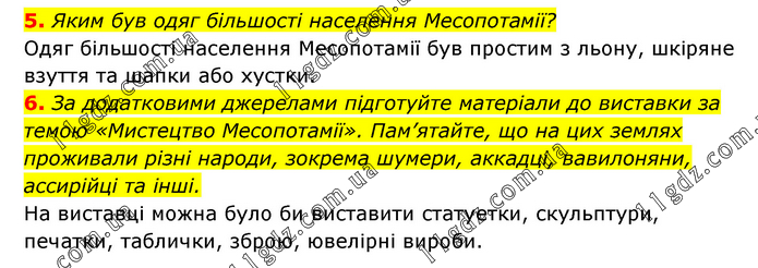5. Яким був одяг більшості населення Месопотамії? Одяг більшості населення Месопотамії був простим з льону, шкіряне взуття та шапки або хустки. 6. За додатковими джерелами підготуйте матеріали до виставки за темою «Мистецтво Месопотамії». Пам’ятайте, що на цих землях проживали різні народи, зокрема шумери, аккадці, вавилоняни, ассирійці та інші. На виставці можна було би виставити статуетки, скульптури, печатки, таблички, зброю, ювелірні вироби.