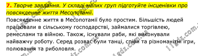 Творче завдання. У складі малих груп підготуйте інсценівки про повсякденне життя Месопотамії. Повсякденне життя в Месопотамії було простим. Більшість людей працювали в сільському господарстві, займалися торгівлею, ремеслами та війною. Також, існували раби, які виконували найважчу роботу. Серед розваг були танці, співи та різноманітні ігри, полювання та риболовля.
