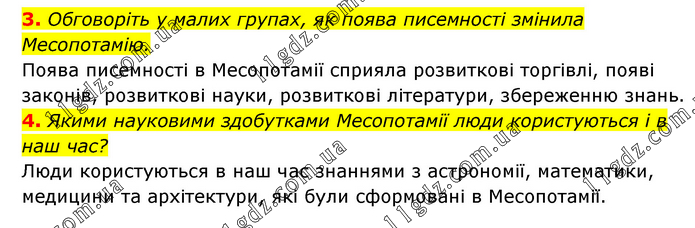 3. Обговоріть у малих групах, як поява писемності змінила Месопотамію. Поява писемності в Месопотамії сприяла розвиткові торгівлі, появі законів, розвиткові науки, розвиткові літератури, збереженню знань. 4. Якими науковими здобутками Месопотамії люди користуються і в наш час? Люди користуються в наш час знаннями з астрономії, математики, медицини та архітектури, які були сформовані в Месопотамії.