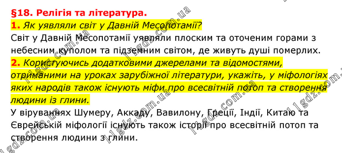 §18. Релігія та література. 1. Як уявляли світ у Давній Месопотамії? Світ у Давній Месопотамії уявляли плоским та оточеним горами з небесним куполом та підземним світом, де живуть душі померлих. 2. Користуючись додатковими джерелами та відомостями, отриманими на уроках зарубіжної літератури, укажіть, у міфологіях яких народів також існують міфи про всесвітній потоп та створення людини із глини. У віруваннях Шумеру, Аккаду, Вавилону, Греції, Індії, Китаю та Єврейській міфології існують також історії про всесвітній потоп та створення людини з глини.