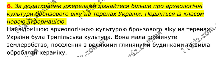 За додатковими джерелами дізнайтеся більше про археологічні культури бронзового віку на теренах України. Поділіться із класом новою інформацією. Найвідомішою археологічною культурою бронзового віку на теренах України була Трипільська культура. Вона мала розвинуте землеробство, поселення з великими глиняними будинками та вміла обробляти кераміку.