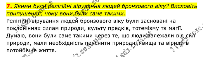 Якими були релігійні вірування людей бронзового віку? Висловіть припущення, чому вони були саме такими. Релігійні вірування людей бронзового віку були засновані на поклоніннях силам природи, культу предків, тотемізму та магії. Думаю, вони були саме такими через те, що люди залежали від сил природи, мали необхідність пояснити природні явища та вірили в потойбічне життя.