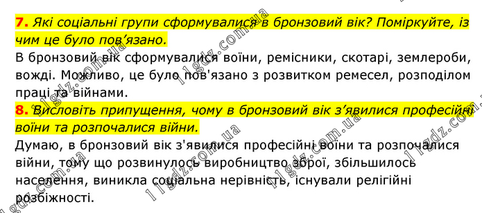 7. Які соціальні групи сформувалися в бронзовий вік? Поміркуйте, із чим це було пов’язано. В бронзовий вік сформувалися воїни, ремісники, скотарі, землероби, вожді. Можливо, це було пов'язано з розвитком ремесел, розподілом праці та війнами. 8. Висловіть припущення, чому в бронзовий вік з’явилися професійні воїни та розпочалися війни. Думаю, в бронзовий вік з'явилися професійні воїни та розпочалися війни, тому що розвинулось виробництво зброї, збільшилось населення, виникла соціальна нерівність, існували релігійні розбіжності.