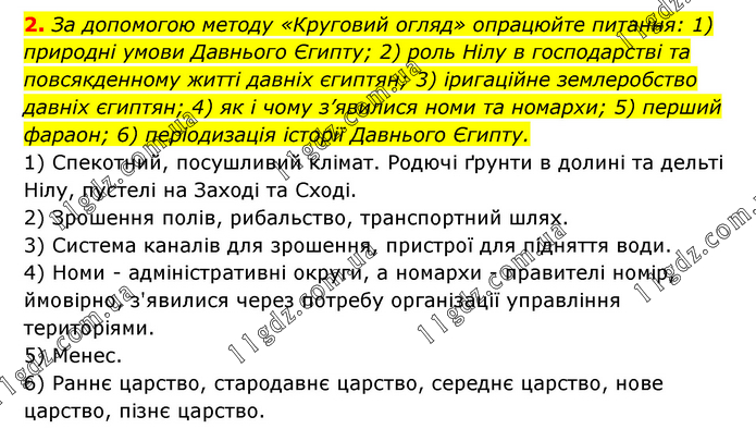 2. За допомогою методу «Круговий огляд» опрацюйте питання: 1) природні умови Давнього Єгипту; 2) роль Нілу в господарстві та повсякденному житті давніх єгиптян; 3) іригаційне землеробство давніх єгиптян; 4) як і чому з’явилися номи та номархи; 5) перший фараон; 6) періодизація історії Давнього Єгипту. 1) Спекотний, посушливий клімат. Родючі ґрунти в долині та дельті Нілу, пустелі на Заході та Сході. 2) Зрошення полів, рибальство, транспортний шлях. 3) Система каналів для зрошення, пристрої для підняття води. 4) Номи - адміністративні округи, а номархи - правителі номір, ймовірно, з'явилися через потребу організації управління територіями. 5) Менес. 6) Раннє царство, стародавнє царство, середнє царство, нове царство, пізнє царство.