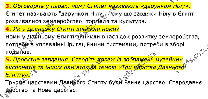 3. Обговоріть у парах, чому Єгипет називають «дарунком Нілу». Єгипет називають "дарунком Нілу", тому що завдяки Нілу в Єгипті розвивалися землеробство, торгівля та культура. 4. Як у Давньому Єгипті виникли номи? Номи у Давньому Єгипті виникли внаслідок розвитку землеробства, потреби в управлінні іригаційними системами, потреби в зборі податків. 5. Проєктне завдання. Створіть колаж із зображень музейних експонатів та інших пам’яток за темою «Три царства Давнього Єгипту». Трьома царствами Давнього Єгипту були Раннє царство, Стародавнє царство та Нове царство.