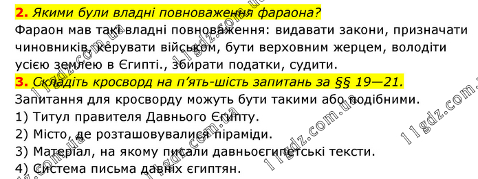 2. Якими були владні повноваження фараона? Фараон мав такі владні повноваження: видавати закони, призначати чиновників, керувати військом, бути верховним жерцем, володіти усією землею в Єгипті., збирати податки, судити. 3. Складіть кросворд на п’ять-шість запитань за §§ 19—21. Запитання для кросворду можуть бути такими або подібними. 1) Титул правителя Давнього Єгипту. 2) Місто, де розташовувалися піраміди. 3) Матеріал, на якому писали давньоєгипетські тексти. 4) Система письма давніх єгиптян.