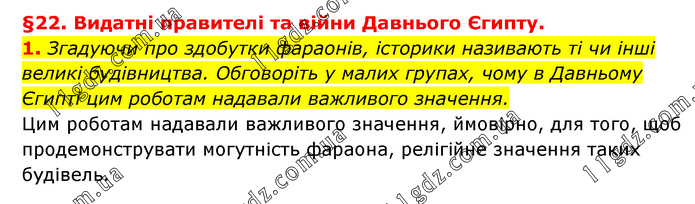 §22. Видатні правителі та війни Давнього Єгипту. 1. Згадуючи про здобутки фараонів, історики називають ті чи інші великі будівництва. Обговоріть у малих групах, чому в Давньому Єгипті цим роботам надавали важливого значення. Цим роботам надавали важливого значення, ймовірно, для того, щоб продемонструвати могутність фараона, релігійне значення таких будівель.