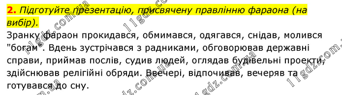 Підготуйте презентацію, присвячену правлінню фараона (на вибір). Зранку фараон прокидався, обмимався, одягався, снідав, молився "богам". Вдень зустрічався з радниками, обговорював державні справи, приймав послів, судив людей, оглядав будівельні проекти, здійснював релігійні обряди. Ввечері, відпочивав, вечеряв та готувався до сну.