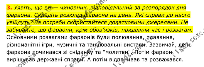 Уявіть, що ви — чиновник, відповідальний за розпорядок дня фараона. Складіть розклад фараона на день. Які справи до нього увійдуть? За потреби скористайтеся додатковими джерелами. Не забувайте, що фараони, крім обов’язків, приділяли час і розвагам. Основними розвагами фараонів були полювання, плавання, різноманітні ігри, музичні та танцювальні вистави. Зазвичай, день фараона починався зі сніданку та "молитви". Потім фараон вирішував державні справи. А потім відпочивав та розважався.