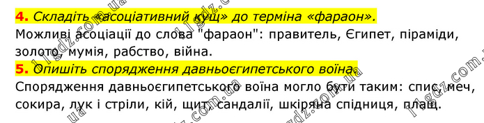 4. Складіть «асоціативний кущ» до терміна «фараон». Можливі асоціації до слова "фараон": правитель, Єгипет, піраміди, золото, мумія, рабство, війна. 5. Опишіть спорядження давньоєгипетського воїна. Спорядження давньоєгипетського воїна могло бути таким: спис, меч, сокира, лук і стріли, кій, щит, сандалії, шкіряна спідниця, плащ.