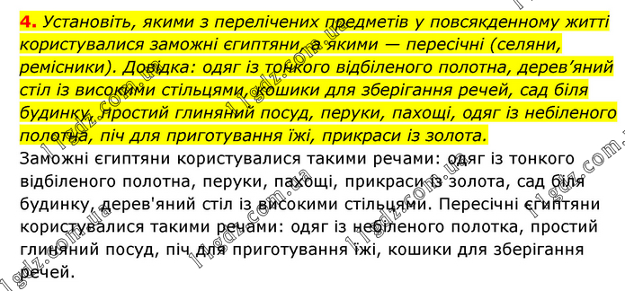 4. Установіть, якими з перелічених предметів у повсякденному житті користувалися заможні єгиптяни, а якими — пересічні (селяни, ремісники). Довідка: одяг із тонкого відбіленого полотна, дерев’яний стіл із високими стільцями, кошики для зберігання речей, сад біля будинку, простий глиняний посуд, перуки, пахощі, одяг із небіленого полотна, піч для приготування їжі, прикраси із золота. Заможні єгиптяни користувалися такими речами: одяг із тонкого відбіленого полотна, перуки, пахощі, прикраси із золота, сад біля будинку, дерев'яний стіл із високими стільцями. Пересічні єгиптяни користувалися такими речами: одяг із небіленого полотка, простий глиняний посуд, піч для приготування їжі, кошики для зберігання речей.