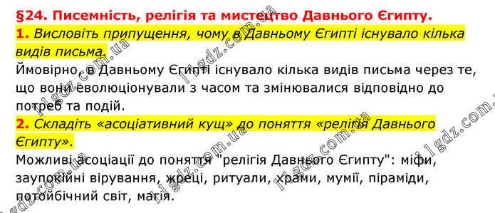 §24. Писемність, релігія та мистецтво Давнього Єгипту. 1. Висловіть припущення, чому в Давньому Єгипті існувало кілька видів письма. Ймовірно, в Давньому Єгипті існувало кілька видів письма через те, що вони еволюціонували з часом та змінювалися відповідно до потреб та подій. 2. Складіть «асоціативний кущ» до поняття «релігія Давнього Єгипту». Можливі асоціації до поняття "релігія Давнього Єгипту": міфи, заупокійні вірування, жреці, ритуали, храми, мумії, піраміди, потойбічний світ, магія.