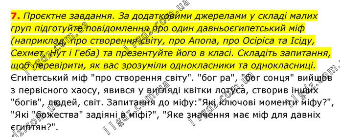 Проєктне завдання. За додатковими джерелами у складі малих груп підготуйте повідомлення про один давньоєгипетський міф (наприклад, про створення світу, про Апопа, про Осіріса та Ісіду, Сехмет, Нут і Геба) та презентуйте його в класі. Складіть запитання, щоб перевірити, як вас зрозуміли однокласники та однокласниці. Єгипетський міф "про створення світу". "бог ра", "бог сонця" вийшов з первісного хаосу, явився у вигляді квітки лотуса, створив інших "богів", людей, світ. Запитання до міфу:"Які ключові моменти міфу?", "Які "божества" задіяні в міфі?", "Яке значення має міф для давніх єгиптян?".
