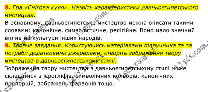 8. Гра «Снігова куля». Назвіть характеристики давньоєгипетського мистецтва. В основному, давньоєгипетське мистецтво можна описати такими словами: канонічне, символістичне, релігійне. Воно мало значний вплив на культури інших народів. 9. Творче завдання. Користуючись матеріалами підручника та за потреби додатковими джерелами, створіть зображення твору мистецтва в давньоєгипетському стилі. Зображення твору мистецтва в давньоєгипетському стилі може складатися з ієрогліфів, символічних кольорів, канонічних пропорцій, зображень фараонів тощо.