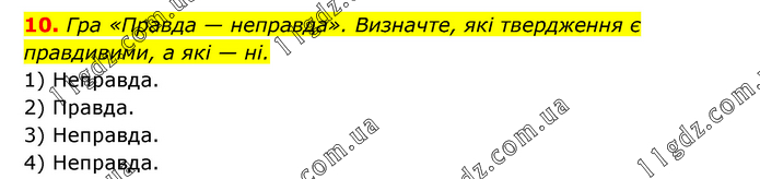Гра «Правда — неправда». Визначте, які твердження є правдивими, а які — ні. 1) Неправда. 2) Правда. 3) Неправда. 4) Неправда.