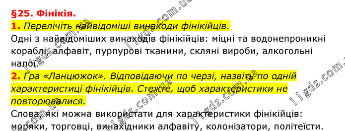 §25. Фінікія. 1. Перелічіть найвідоміші винаходи фінікійців. Одні з найвідоміших винаходів фінікійців: міцні та водонепроникні кораблі, алфавіт, пурпурові тканини, скляні вироби, алкогольні напої. 2. Гра «Ланцюжок». Відповідаючи по черзі, назвіть по одній характеристиці фінікійців. Стежте, щоб характеристики не повторювалися. Слова, які можна використати для характеристики фінікійців: моряки, торговці, винахідники алфавіту, колонізатори, політеїсти.