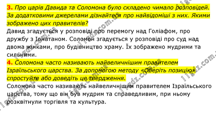 3. Про царів Давида та Соломона було складено чимало розповідей. За додатковими джерелами дізнайтеся про найвідоміші з них. Якими зображено цих правителів? Давид згадується у розповіді про перемогу над Голіафом, про дружбу з Іонатаном. Соломон згадується у розповіді про суд над двома жінками, про будівництво храму. Їх зображено мудрими та сильними. 4. Соломона часто називають найвеличнішим правителем Ізраїльського царства. За допомогою методу «Оберіть позицію» спростуйте або доведіть це твердження. Соломона часто називають найвеличнішим правителем Ізраїльського царства, тому що він був мудрим та справедливим, при ньому розквітнули торгівля та культура.