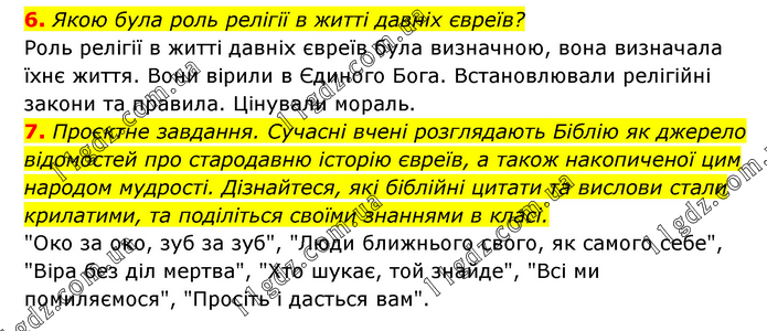 6. Якою була роль релігії в житті давніх євреїв? Роль релігії в житті давніх євреїв була визначною, вона визначала їхнє життя. Вони вірили в Єдиного Бога. Встановлювали релігійні закони та правила. Цінували мораль. 7. Проєктне завдання. Сучасні вчені розглядають Біблію як джерело відомостей про стародавню історію євреїв, а також накопиченої цим народом мудрості. Дізнайтеся, які біблійні цитати та вислови стали крилатими, та поділіться своїми знаннями в класі. "Око за око, зуб за зуб", "Люди ближнього свого, як самого себе", "Віра без діл мертва", "Хто шукає, той знайде", "Всі ми помиляємося", "Просіть і дасться вам".