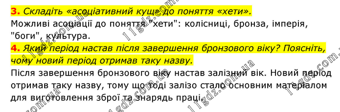 3. Складіть «асоціативний кущ» до поняття «хети». Можливі асоціації до поняття "хети": колісниці, бронза, імперія, "боги", культура. 4. Який період настав після завершення бронзового віку? Поясніть, чому новий період отримав таку назву. Після завершення бронзового віку настав залізний вік. Новий період отримав таку назву, тому що тоді залізо стало основним матеріалом для виготовлення зброї та знарядь праці.
