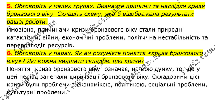 5. Обговоріть у малих групах. Визначте причини та наслідки кризи бронзового віку. Складіть схему, яка б відображала результати вашої роботи. Ймовірно, причинами кризи бронзового віку стали природні катаклізми, війни, економічні проблеми, політична нестабільність та перерозподіл ресурсів. 6. Обговоріть у парах. Як ви розумієте поняття «криза бронзового віку»? Які можна виділити складові цієї кризи? Поняття "криза бронзового віку" означає, на мою думку, те, що у цей період занепали цивілізації бронзового віку. Складовими цієї кризи були проблеми з економікою, політикою, соціальні проблеми, культурні проблеми.