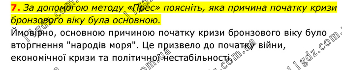 За допомогою методу «Прес» поясніть, яка причина початку кризи бронзового віку була основною. Ймовірно, основною причиною початку кризи бронзового віку було вторгнення "народів моря". Це призвело до початку війни, економічної кризи та політичної нестабільності.