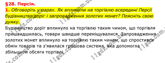 §28. Персія. 1. Обговоріть у парах. Як вплинули на торгівлю всередині Персії будівництво доріг і запровадження золотих монет? Поясніть свою думку. Будівництво доріг вплинуло на торгівлю таким чином, що торгівля пришвидшилась, товари швидше переміщувалися. Запровадження золотих монет вплинуло на торгівлю таким чином, що спростився обмін товарів та з'явилася грошова система, яка допомогла збільшити обсяги торгівлі.