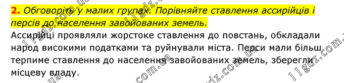 2. Обговоріть у малих групах. Порівняйте ставлення ассирійців і персів до населення завойованих земель. Ассирійці проявляли жорстоке ставлення до повстань, обкладали народ високими податками та руйнували міста. Перси мали більш терпиме ставлення до населення завойованих земель, зберегли місцеву владу.