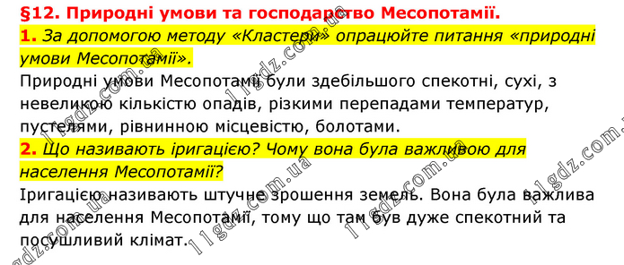 §12. Природні умови та господарство Месопотамії. 1. За допомогою методу «Кластери» опрацюйте питання «природні умови Месопотамії». Природні умови Месопотамії були здебільшого спекотні, сухі, з невеликою кількістю опадів, різкими перепадами температур, пустелями, рівнинною місцевістю, болотами. 2. Що називають іригацією? Чому вона була важливою для населення Месопотамії? Іригацією називають штучне зрошення земель. Вона була важлива для населення Месопотамії, тому що там був дуже спекотний та посушливий клімат.