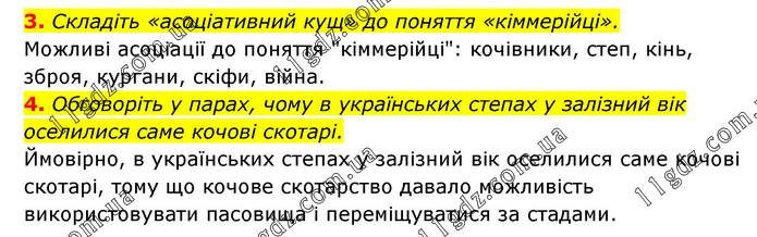 3. Складіть «асоціативний кущ» до поняття «кіммерійці». Можливі асоціації до поняття "кіммерійці": кочівники, степ, кінь, зброя, кургани, скіфи, війна. 4. Обговоріть у парах, чому в українських степах у залізний вік оселилися саме кочові скотарі. Ймовірно, в українських степах у залізний вік оселилися саме кочові скотарі, тому що кочове скотарство давало можливість використовувати пасовища і переміщуватися за стадами.