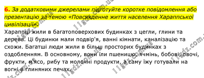 За додатковими джерелами підготуйте коротке повідомлення або презентацію за темою «Повсякденне життя населення Хараппської цивілізації». Хараппці жили в багатоповерхових будинках з цегли, глини та дерева. Ці будинки мали подвір'я, ванні кімнати, каналізацію та схожи. Багатші люди жили в більш просторих будинках з оздобленням. В основному, вони їли пшеницю, ячмінь, бобові, овочі, фрукти, м'ясо, рибу та молочні продукти, а саму їжу готували на вогні в глиняних печах.