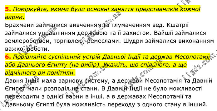 5. Поміркуйте, якими були основні заняття представників кожної варни. Брахмани займалися вивченням та тлумаченням вед. Кшатрії займалися управлінням державою та її захистом. Вайшії займалися землеробством, торгівлею, ремеслами. Шудри займалися виконанням важкої роботи. 6. Порівняйте суспільний устрій Давньої Індії та держав Месопотамії або Давнього Єгипту (на вибір). Укажіть, що спільного, а що відмінного ви помітили. Давня Індія мала варнову систему, а держави Месопотамія та Давній Єгипет мали розподіл на стани. В Давній Індії не було можливості переходити з однієї варни в інші, а в державах Месопотамії та Давньому Єгипті була можливість переходу з одного стану в інший.
