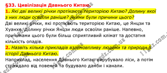 §33. Цивілізація Давнього Китаю. 1. Які дві великі річки протікають територією Китаю? Долину якої з них люди освоїли раніше? Якими були причини цього? Дві великі річки, які протікають територією Китаю, це Янцзи та Хуанхе. Долину річки Янцзи люди освоїли раніше. Напевно, причинами цього були більш сприятливий клімат та достатня кількість опадів. 2. Назвіть кілька прикладів взаємовпливу людини та природи з історії Давнього Китаю. Наприклад, населення Давнього Китаю вирубувало ліси, а потім страждало від повеней та будувало дамби і канали.