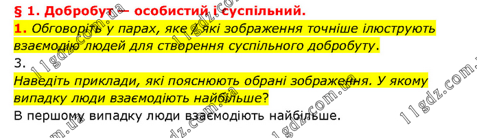 § 1. Добробут — особистий і суспільний. 1. Обговоріть у парах, яке / які зображення точніше ілюструють взаємодію людей для створення суспільного добробуту. 3. Наведіть приклади, які пояснюють обрані зображення. У якому випадку люди взаємодіють найбільше? В першому випадку люди взаємодіють найбільше.