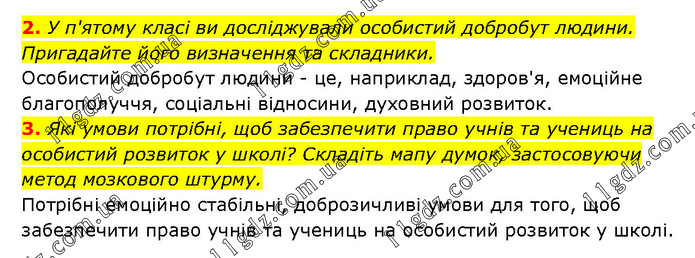 2. У п'ятому класі ви досліджували особистий добробут людини. Пригадайте його визначення та складники. Особистий добробут людини - це, наприклад, здоров'я, емоційне благополуччя, соціальні відносини, духовний розвиток. 3. Які умови потрібні, щоб забезпечити право учнів та учениць на особистий розвиток у школі? Складіть мапу думок, застосовуючи метод мозкового штурму. Потрібні емоційно стабільні, доброзичливі умови для того, щоб забезпечити право учнів та учениць на особистий розвиток у школі.