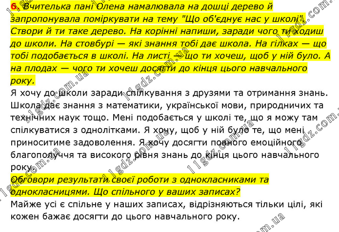Вчителька пані Олена намалювала на дошці дерево й запропонувала поміркувати на тему "Що об'єднує нас у школі". Створи й ти таке дерево. На корінні напиши, заради чого ти ходиш до школи. На стовбурі — які знання тобі дає школа. На гілках — що тобі подобається в школі. На листі — що ти хочеш, щоб у ній було. А на плодах — чого ти хочеш досягти до кінця цього навчального року. Я хочу до школи заради спілкування з друзями та отримання знань. Школа дає знання з математики, української мови, природничих та технічних наук тощо. Мені подобається у школі те, що я можу там спілкуватися з однолітками. Я хочу, щоб у ній було те, що мені приноситиме задоволення. Я хочу досягти повного емоційного благополуччя та високого рівня знань до кінця цього навчального року. Обговори результати своєї роботи з однокласниками та однокласницями. Що спільного у ваших записах? Майже усі є спільне у наших записах, відрізняються тільки цілі, які кожен бажає досягти до цього навчального року.